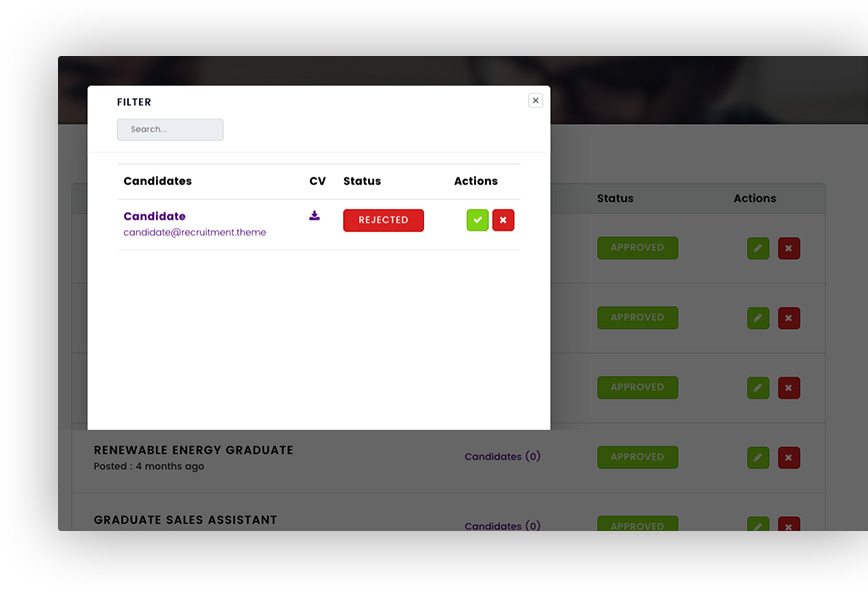 Clicking into the applications for each job displays a modal with a list of all the applicants. From this modal you can view the CV they uploaded with their application, and approve or reject each application.